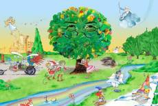Ein junger Baum wird gepflanzt. Menschen und Tiere wünschen sich, dass er schnell wachse. Sie wollen seine Früchte essen, in seinem Schatten...