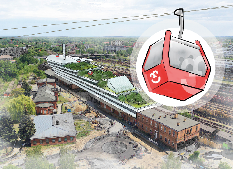 Direkt am letzten Gleis befinden sich langgestreckte Backsteingebäude, einst als Lager- und Bürogebäude genutzt. Hier kann der Mix aus zwei Entwicklungsimpulsen für den wohl symbolträchtigsten Leuchtturm im Lausitzer Wandel sorgen. Zum einen wäre das als technische Innovation eine Seilbahn, die als Teil des öffentlichen Nahverkehrs, von Cottbusverkehr betrieben, den Bahnhof mit dem Ostsee verbindet. Über Zwischenstationen mit Halt am Bahnhof Sandower Dreieck wären das Stadion der Freundschaft und die Parklandschaften vom Spreeauen- über den Tier- bis zum Branitzer Park angebunden, über eine weitere Zwischenstation wäre die künftige klimaneutrale Seevorstadt auch klimaneutral ins öffentliche Verkehrsnetz eingebunden. Die Seilbahn eint viele Vorteile: Sie erfordert wenig Eingriff in die bestehende Infrastruktur, kann dadurch viel schneller und günstiger als eine Bahn errichtet werden, schont Flächen am künftigen Ostsee, ist insgesamt kostengünstig, kann flexibel getaktet werden und könnte per Antrieb mit erneuerbarer Energie ein klimafreundliches Pilotmodell von europäischem Rang sein. Seilbahnen sind anderswo auf der Welt als Innovationen im urbanen Nahverkehr bereits in Betrieb. Sie entlasten Straßen, sind emissionsfrei, nutzen den kürzesten Weg, haben keine Wartezeiten, sind barrierefrei – und vor allem umweltfreundlich.