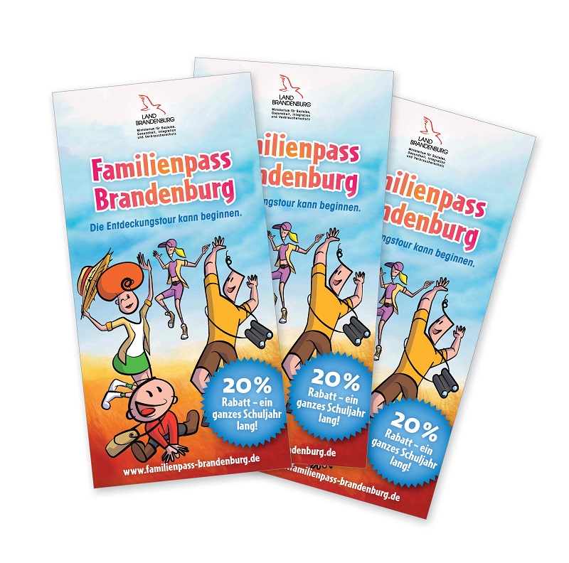 Der Familienpass Brandenburg ist der Planer für erlebnisreiche Unternehmungen für ganz Brandenburg. Ausflugshungrige entdecken darin über 400 Ziele für unvergessliche Familienabenteuer. Dazu zählen auch viele Familien-Freizeitanbieter im Spreewald und in der Lausitz. Sparen steht beim Familienpass hoch im Kurs. Eltern, Großeltern, Tante oder Onkel erhalten bei Ausflügen mit den Kindern bei jedem Ausflugsziel entweder 20% Rabatt, einen individuellen Preisnachlass (z.B. ein Kind kostenfrei) oder ein kostenfreies Angebot.
