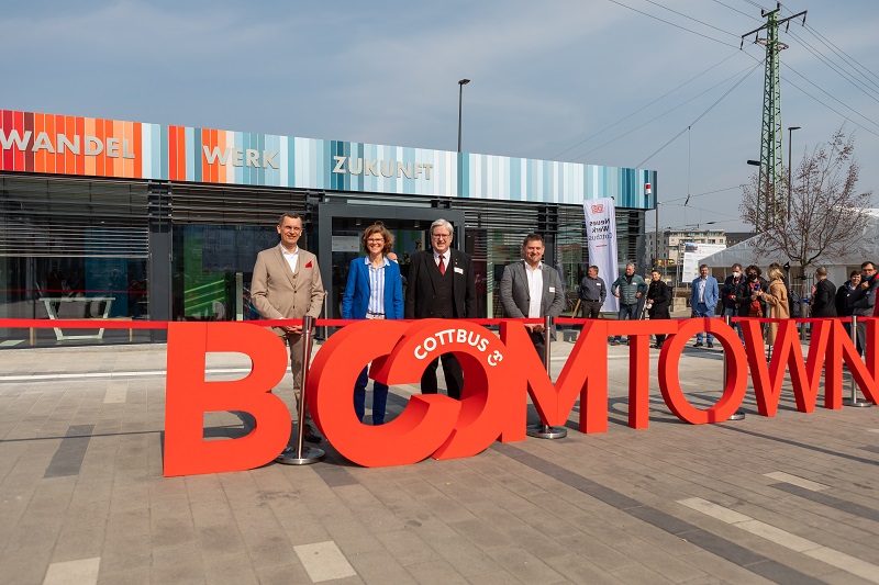 Seit 23. März hat genau vor dem Hauptbahnhof Cottbus ein ganz besonderer Ort für alle Lausitzer und Besucher der Region geöffnet. Ein Infopavillon gibt als Schaufenster einen Einblick in den Struktuwandel der Region – und gleichzeitig einen Überblick über all die Projekte und Vorhaben, die mit den 17 Milliarden Strukturgeldern für den Wandel der Lausitz sorgen sollen. Vom Bahnwerk bis zum Lausitz Science Park findet man an Touchscreens samt Hörmuschel Animationen, Filme, Spannendes zum digitalen Blättern oder Zuhören. Hier gibt es auch Informationen zu Europas modernstem Bahnwerk, das gerade auf der anderen Seite der Gleise entsteht und künftig den ICE4 instandhalten wird.