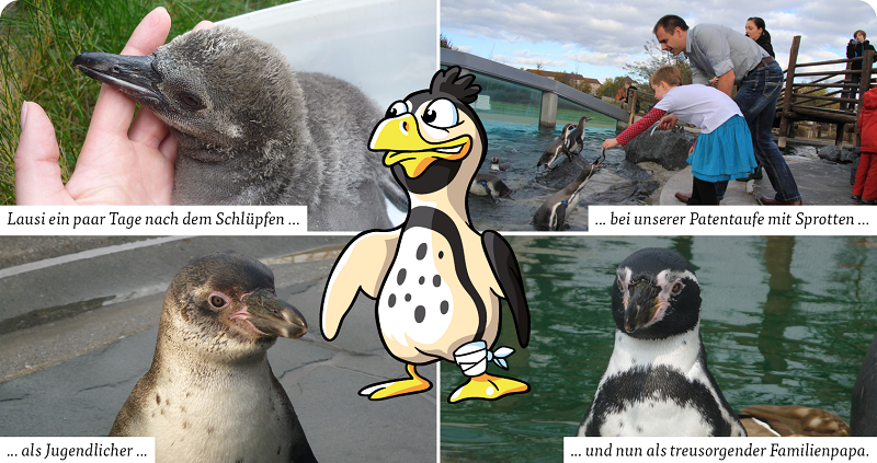 „Unser“ Lausi ist vom Patenkind längst zum liebevollen Familienpapa geworden – und ein ganz besonderer Frackträger. Seinen Namen hat er von uns erhalten und wir haben uns ganz gezielt für Lausi entschieden. Er hatte einen recht schwierigen Start ins Leben, als „Frühchen“ musste er mühsam aufgepeppelt werden – Tierpflegerin Laura hatte ihn fast ein halbes Jahr auf dem heimischen Balkon mit wahrer Pinguin-Mutterliebe großgezogen. Lange Zeit war ein Hinkebeinchen das sichtbare Zeichen seiner Startschwierigkeiten, deshalb trägt er als Comicfigur auch den niedlichen Verband an der linken Flosse.