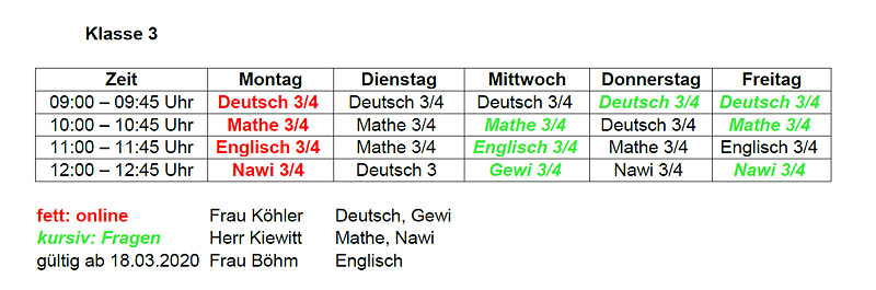 Aus Sicht der Archimedes Grundschule Forst ist der persönliche Kontakt via Videokonferenz vor allem für jüngere Schüler sehr wichtig. Hier zu sehen: Der „Notfall-Stundenplan“ für die Homeschooling-Zeit. Rot markierte Fächer werden online absolviert, zu den grünen Zeiten sind Nachfragen möglich.