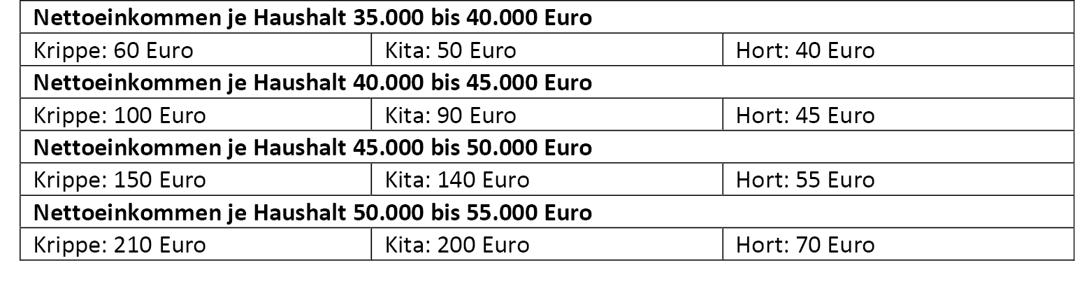 Nach Angaben von SPD-Fraktionschef Daniel Keller zahlen mit rund 30.000 bis 40.000 Eltern geringere Beiträge als bisher. Für alle mit einem Einkommen von mehr als 55.000 Euro pro Jahr ändern sich die Beiträge jedoch nicht. Darüber hinaus ist eine Deckelung der Kita-Höchstbeiträge vorgesehen, die vom Nettoeinkommen ab 35.000 Euro aufwärts abhängig ist. Die Beiträge sollen folgendermaßen gestaffelt sein: