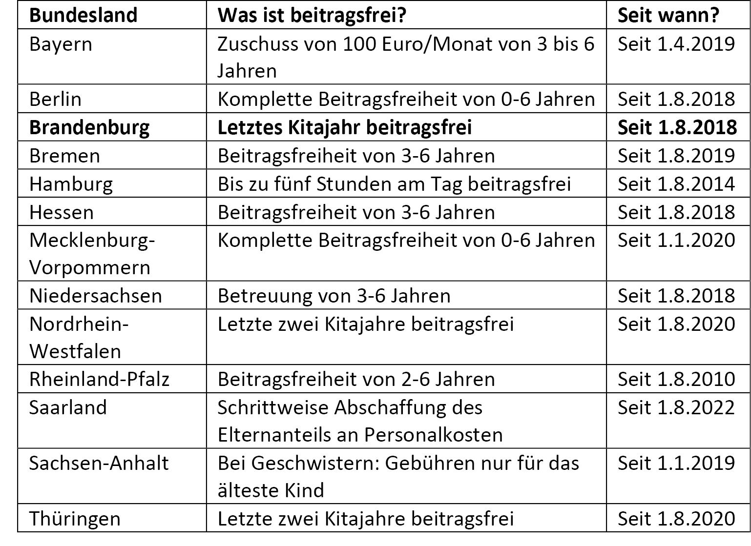 Über diese Entlastung hinaus plant die Landesregierung ab dem 1. August 2023 neben dem letzten auch das vorletzte Kitajahr beitragsfrei zu gestalten. Ein Jahr später folgt das drittletzte Jahr, sodass dann nur noch Krippenkinder aus bestimmten Einkommensschichten für den Kitabesuch zahlen müssen. Damit befindet sich Brandenburg im deutschlandweiten Mittelfeld – wir werfen einen Blick auf die anderen Bundesländer: