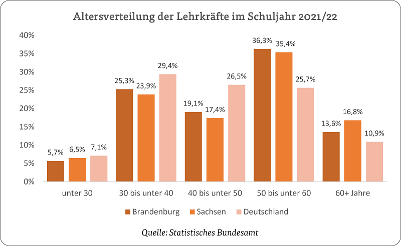 Dem momentan geringen Nachwuchsaufkommen stehen viele ältere Lehrkräfte gegenüber, die in den kommenden Jahren in den Ruhestand gehen. Über 3.000 brandenburgische Lehrer sind 60 Jahre oder älter, in Sachsen mehr als 5.500. Demgegenüber stehen rund 1.200 junge Kräfte in Brandenburg bzw. 2.100 sächsische Lehrer. Die Fehlkalkulationen der Vergangenheit werden hier nochmals deutlich.