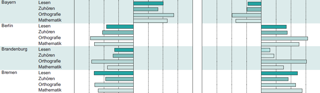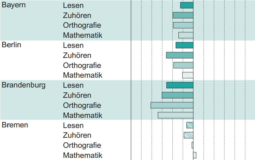 Eine Ansammlung von Balken verdeutlicht die Misere: Auf diesem Ausschnitt aus dem IQB-Bildungstrend sieht man links die Anteile an Viertklässlern, die den Mindeststandard erreicht oder übertroffen haben – im Verhältnis zum deutschlandweiten Durchschnitt. Rechts wird wiederum verdeutlicht, wo der Standard nicht erreicht wird. Während Bayern besonders gut dasteht, schnitten Berlin, Brandenburg und Bremen von allen Bundesländern am schlechtesten ab.