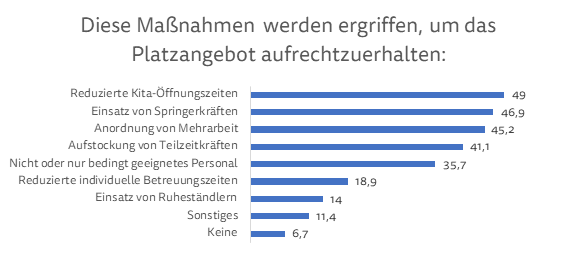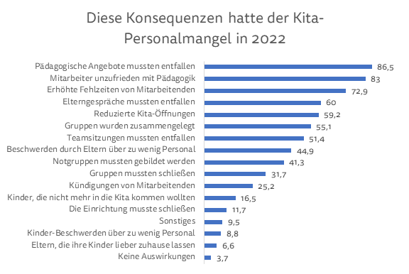 Auch die weiteren Ergebnisse sind alarmierend. 64 Prozent der befragten Kitaleitungen erklärten, dass sie in den zurückliegenden zwölf Monaten in mehr als einem Fünftel der Zeit in Personalunterdeckung gearbeitet hätten. In jeder sechsten Kita war das sogar in mehr als 60 Prozent der Zeit der Fall. Fast alle Befragten (97 Prozent) stimmten der Aussage zu, dass die hohe Arbeitsbelastung zu höheren Fehlzeiten und Krankschreibungen führt – ein Teufelskreis.