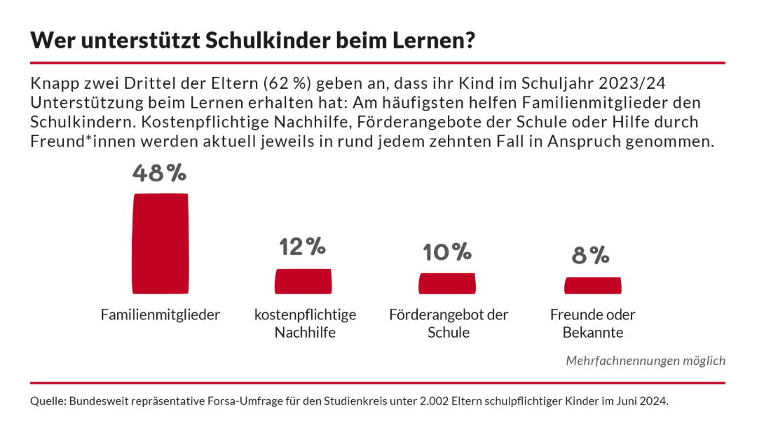 Es ist also davon auszugehen, dass viele Familien auch im anstehenden Schulhalbjahr schauen müssen, wie sie den Ausfall kompensieren. Eine Möglichkeit ist professionelle Nachhilfe. Beim großen Anbieter Studienkreis verzeichnet man seit etwa zwei Jahren eine verstärkte Nachfrage.Es gibt wenig Statistiken, wie viele Kinder tatsächlich professionelle Nachhilfe in Anspruch nehmen – nach den letzten Erhebungen von 2014 und 2024 sind es zwischen 12 und 14 Prozent. Manche Kinder nehmen Förderangebote in der Schule wahr oder Familienmitglieder übernehmen die Nachhilfe. Davon allerdings raten Fachleute ab. Denn oft führt es zu Streit und Frust, wenn Mama oder Papa die Rolle des Nachhilfelehrers übernimmt. Viele Eltern dürften das vom leidigen Streit über die Hausaufgaben kennen.