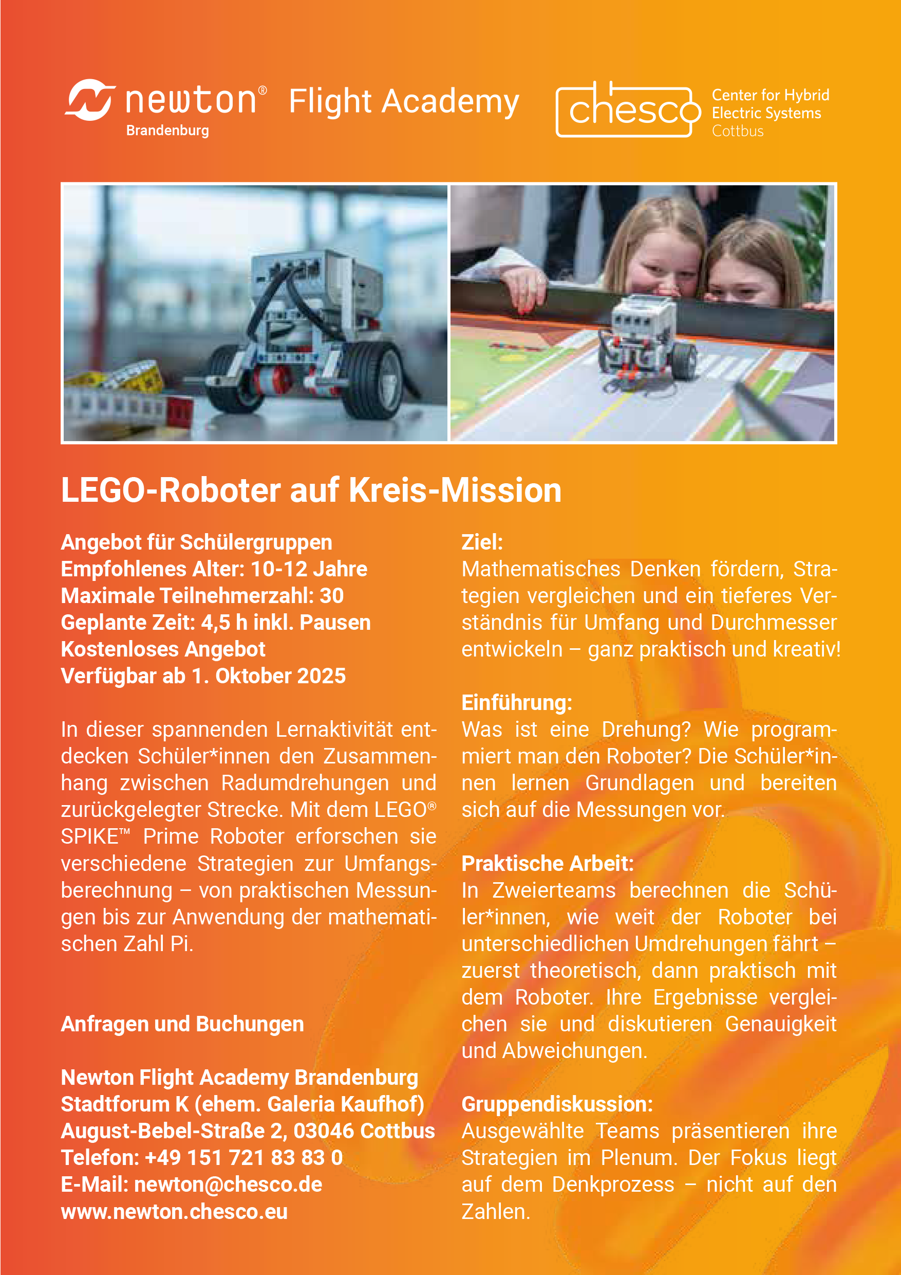 Ab dem neuen Schuljahr erweitert die Newton Flight Academy Brandenburg ihr Programm um ein drittes Modul: „LEGO-Roboter auf Kreis-Mission“. In dieser Lernaktivität erforschen Schüler*innen der Klassenstufen 5 und 6 spielerisch den Zusammenhang zwischen Radumdrehungen und zurückgelegter Strecke. Mit LEGO® SPIKE™ Prime Robotern berechnen sie Umfänge, vergleichen Strategien und entdecken dabei ganz praktisch die mathematische Zahl Pi.