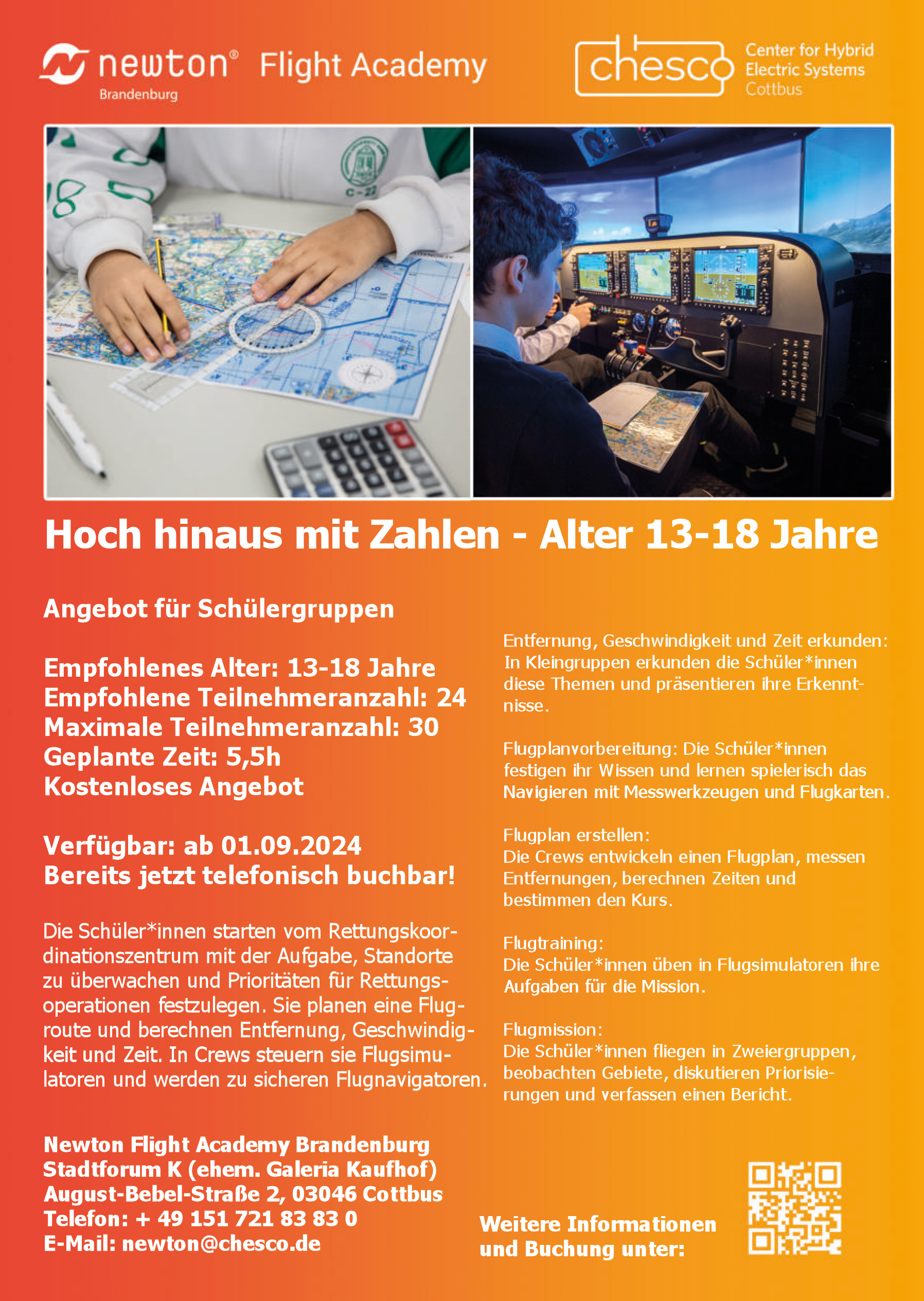 Seit einem Jahr bereichert die Newton Flight Academy Brandenburg die Lausitz mit einer außergewöhnlichen Attraktion. Im ehemaligen Galeria Kaufhof, heute Stadtforum K in Cottbus, können Kinder, Jugendliche und Erwachsene die Faszination des Fliegens hautnah erleben. Die Academy ist Teil eines weltweiten Netzwerks mit Standorten in Metropolen wie Rom oder Peking und wurde in enger Zusammenarbeit mit internationalen Partnern wie Boeing und First Scandinavia entwickelt. Inzwischen hat sich die Einrichtung fest etabliert und bietet drei klar strukturierte Module für Kinder und Jugendliche an: Im modernen Newton-Klassenzimmer werden naturwissenschaftliche Grundlagen vermittelt, danach können die Schüler*innen eigenständig forschen und berechnete Flugmissionen vorbereiten, die anschließend an den drei hochmodernen Full-Motion-Simulatoren geflogen werden. Vorschulkinder bekommen spielerische Einblicke in die Welt der Hummel. Sie singen und agieren mit einem Hummelplüschtier und seit neustem auch in einem Hummelsimulator.