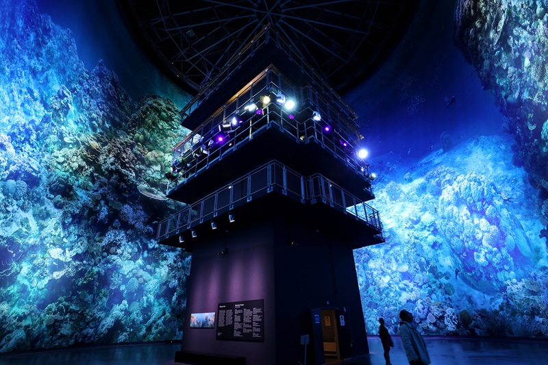 Das Great Barrier Reef – das größte Korallenriff unseres Planeten – entfaltet sich auf über 3.000 Quadratmetern Panoramafläche in überwältigender Detailfülle und Farbintensität. Besucher tauchen, umspannt vom Kunstwerk mit rund 106 Metern Länge und 27 Metern Höhe, quasi direkt ins Korallenriff ein. Aus der fiktiven Perspektive unterhalb der Meeresoberfläche erleben sie die fragile Schönheit einer Welt, die dem Menschen sonst meist verborgen bleibt. Schillernde Korallen, farbenfrohe Fischschwärme und die Lichtbrechung in den blauen und grünen Tiefen des Ozeans erzeugen ein immersives Raumerlebnis, das zum Staunen einlädt – und zugleich sensibilisiert. Durch Plattformen auf unterschiedlichen Höhen eröffnet sich aus der Mitte des Raums der Blick auf die unterschiedlichen Ebenen des Korallenriffs mit ihrer ganz unterschiedlichen Fauna und Flora.