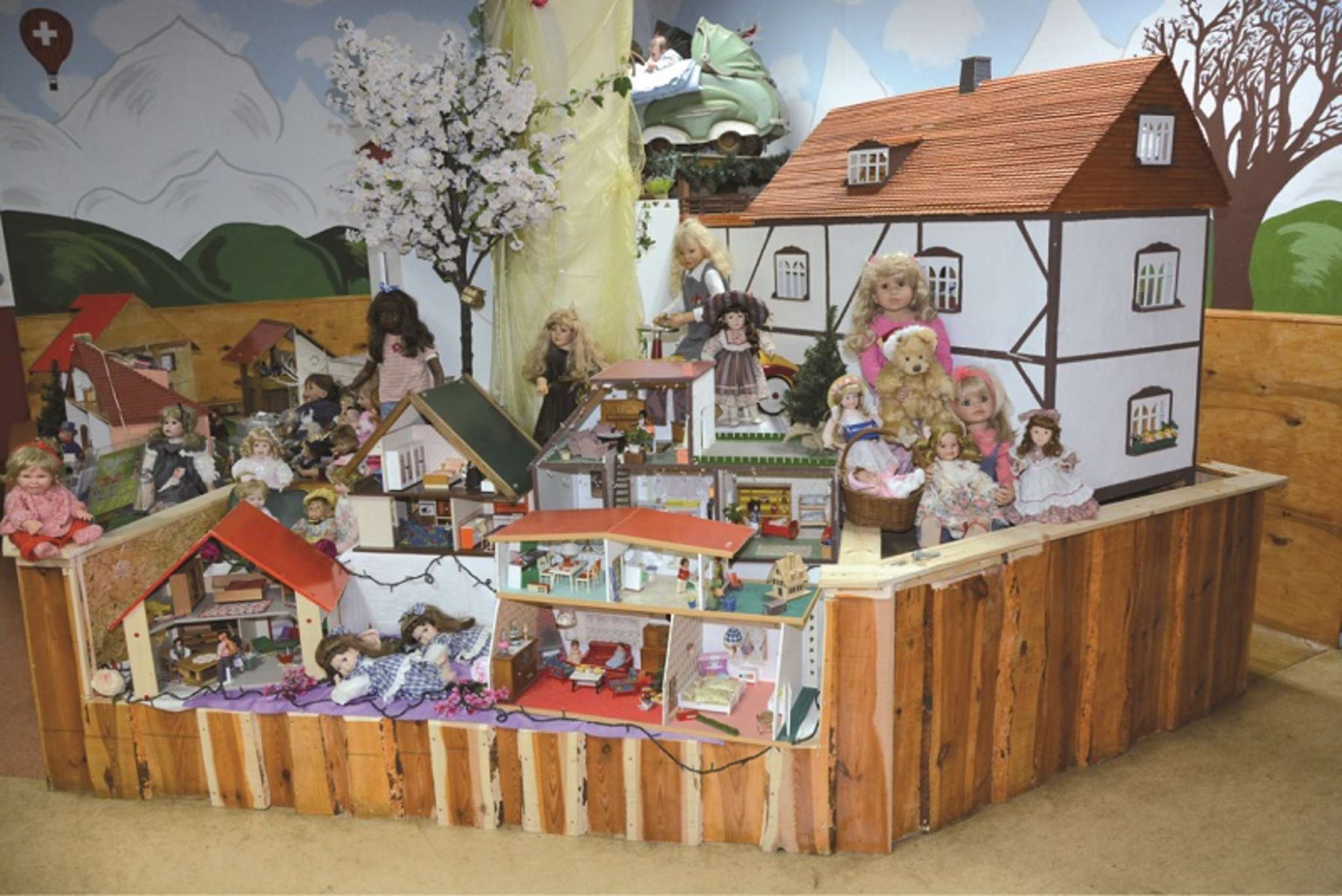 Mein Mann geht schon lange dem Hobby Modelleisenbahn nach. Wenn wir gemeinsam auf Ausstellungen waren, habe ich oft die etwas gelangweilten Frauen gesehen und gedacht: Das muss doch auch anders gehen. Dann haben wir uns im Verein entschlossen, die Modellbahnanlagen um eine Puppenwelt zu ergänzen, in der die Puppen nicht einfach aufgereiht nebeneinander sitzen, sondern in einer passenden Kulisse zu erleben sind. Die meisten davon sind Marke Eigenbau: die großen Häuser, das Riesenrad, das Karussell. Unsere Vereinsmitglieder haben da viel Zeit investiert und die Ausstellung mit Liebe zum Detail gestaltet.