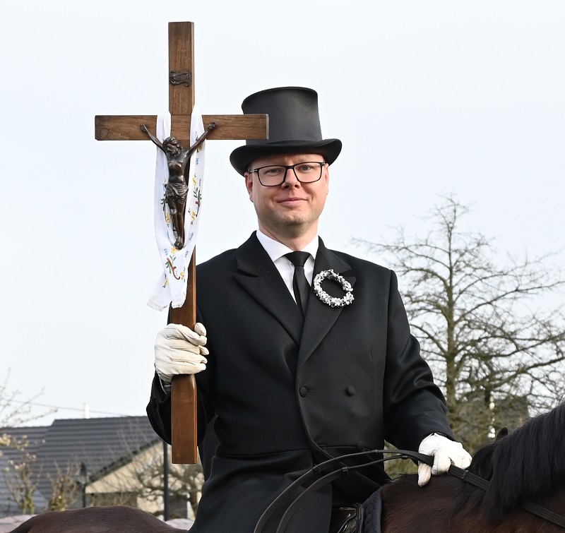 Ein Osterbrauch, der in unserer Familie einen sehr hohen Stellenwert hat, ist das Osterreiten, das „jutrowne jěchanje“. Aus vorchristlichen Flurumgängen und -umritten zum Erbitten günstiger Bedingungen für ein gutes Aufgehen der Saat und deren Bewahrung vor schlechtem Wetter, entwickelten sich christliche Prozessionen. Heute erinnert nur noch in Ostro der morgendliche Saatumritt an die ursprünglichen Flurumgänge. Die Osterreiterprozessionen begeben sich am Ostersonntag in die jeweilige Nachbarkirchgemeinde und tragen die frohe Botschaft vom auferstandenen Christus weiter, um sie den dortigen Bewohnern zu verkünden. Festlich gekleidete Reiter in Gehrock und Zylinder führen Kirchenfahnen, Kreuz und Statue des Auferstandenen auf prächtig, mit edlem Zaumzeug, Blumenranken und mit bestickten Schleifen geschmückten Pferden. Ich habe diesen Brauch als kleiner Junge erlebt und habe die Leidenschaft von meinem Vater geerbt. Seit meinem 15. Lebensjahr nehme ich alljährlich am Osterreiten teil. Anfänglich gemeinsam mit meinem Vater, inzwischen auch mit unserem ältesten Sohn. Einmal mussten wir aussetzen – das Coronajahr war ein einschneidendes Erlebnis. Umso mehr freuen wir uns, dass es der Tradition nicht geschadet hat.