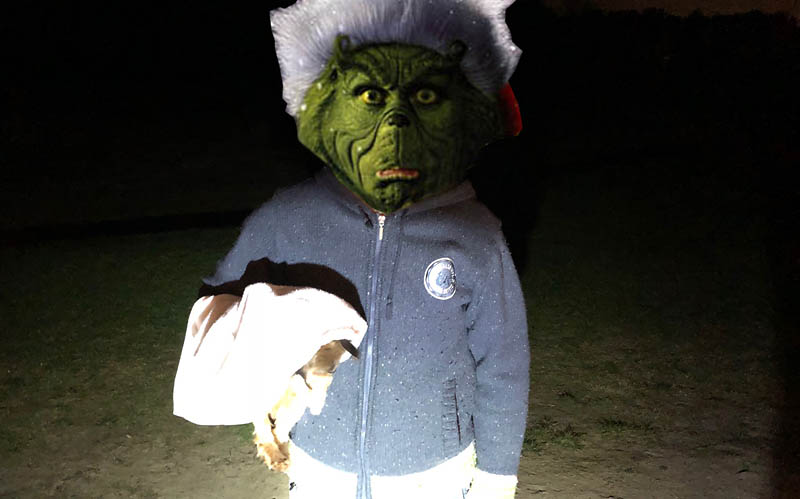Also parkte ich am Zampertag unsere Autos in einer Straße um die Ecke und wir verschanzten uns in unserem Haus. Als es am späten Nachmittag dunkel wurde, spielte ich im Haus mit den Kids Erschrecken mit Leuchtfarben. Jeder musste sich unter der Decke mit Leuchtfarben eine schreckliche Fratze malen, mit der Taschenlampe drei Minuten anleuchten, und dann schlichen wir durchs Haus und erschreckten uns gegenseitig. Bei alledem achteten wir immer darauf, dass draußen kein Licht zu sehen war und die Zampergemeinde unser „unbewohntes“ Haus verschont. Leider erschwerte unsere vierbeinige Sofarolle meinen Plan. Nachdem mir unsere Minidogge eine halbe Stunde hinterherwuselte, war klar, dass sie zum Geschäft nach draußen musste. Ich schlich mit ihr durch die Hintertür und im Rahmen unserer Geheimmission verzichtete ich sogar auf die Taschenlampe. Mann, war ich orientierungslos. Ich vergaß ein zwischen Bäumen gespanntes Seil und strangulierte mich fast, mich darüber ärgernd rannte ich gleich gegen den nächsten Ast und schlug mir heftig den Kopf an. Leise fluchend kehrte ich vom Gassigehen heim, als sich die kleine Sofarolle selbständig machte und am Haus vorbei durch die Rabatten zur Vordertür stürmte. Dabei schleifte sie das Wintervlies von meinem Kräuterbeet mit, ich stürmte dem Geisterhund hinterher. Vorn angekommen, sah ich den Grund: die Dorfjugend erstarrte vor dem Anblick des Geisterhunds und der ihm folgenden Kreatur, die von ihren Taschenlampen angefunzelt grell leuchtete, mit blutendem Kopf und stranguliertem Hals. Die Meute flüchtete völlig irritiert. Seitdem bildet sich im Dorf die Legende vom Faschingsgrinch. Na und, meine Kids sind stolz wie Bolle und mir blieb der Schnaps erspart. Helau!