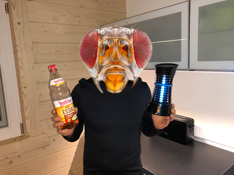 Einen Tag später traf per Eilbestellung ein großes Paket ein. Fünf Fruchtfliegenlebendfallen reihten sich an ein Schüsselbataillon mit Bautzner Apfelessig und als Endgegner hatte ich einen hypermodernen, elektrischen Fruchtfliegen-Vernichter mit magischem blauen Licht und einem Grillgitter drumherum geordert. Pah, mit Superdaddy legt sich niemand an, rief ich lauthals aus der Küche und hatte mir auf ein altes Arbeitsshirt mit einem Edding „Mr. Flymaster“ aufgepinselt. Als meine Kleine in die Küche eilte, zischte es gerade leise am Gitter des Fruchtfliegen-Elektrogrills.