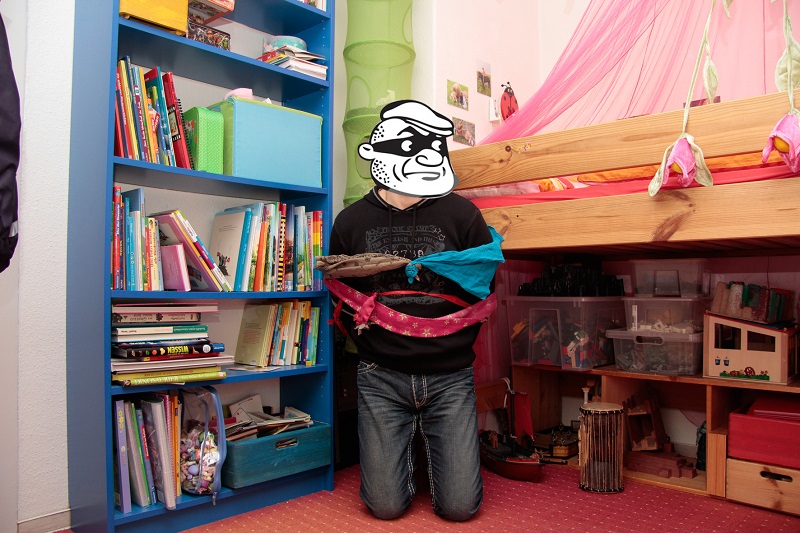 Die Recherchen unserer Detektiv-Bande waren dagegen doch um Einiges harmloser. Zumindest bis zu dem Nachmittag, an dem Papa als Super-Verbrecher sein Unwesen in der Wohnung treiben musste. Natürlich nahm mich das Detektiv-Duo fest und fesselte mich am Pfosten des Hochbetts. Professionell, mit Beinen und Armen. Im Nachhinein bin ich erstaunt, wie viele Knoten Kinder im Alter von sechs und neun Jahren schon beherrschen. Ich konnte mich tatsächlich nicht befreien. Nun kam mein kleiner Austrickser und nutze die Gelegenheit zum nächsten Schlag. Er holte die Kinder unserer Nachbarn und veranstaltete ein großes Verbrecher-Zielwerfen mit kleinen Gummibällen. Auf den Kopf gab es 100 Punkte. Auf drei Meter Entfernung verfehlten sie trotz Gegenwehr die Höchstpunktzahl leider nur selten. In einem guten Film hätte ich mir den Daumen gebrochen, um mich zu entfesseln und die Strolche in die Flucht geschlagen. So musste ich auf meine bessere Hälfte warten, die erst eine Stunde später nach Hause kam. Aber auch sie nahm erst mal 5 Runden mit insgesamt 500 Punkten am Wettbewerb teil. Anschließend wurden noch etliche Siegerfotos vor der lebenden Verbrecher-Zielscheibe angefertigt, bevor ich endlich befreit wurde und wieder Papa sein durfte.