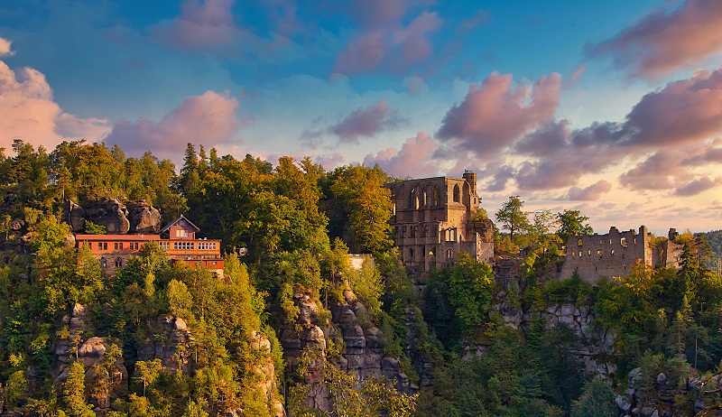 Eingebettet in eine zauberhafte Berglandschaft thronen auf dem Fels Oybin die mächtigen Ruinen der Burg, die sich Kaiser Karl IV. zu seinem Alterssitz ausbauen ließ – und die eines Klosters der Cölestiner. Das Felsmassiv war nicht nur ein beliebtes Motiv für die Maler der Romantik wie C. D. Friedrich, auch die Gebrüder Grimm schrieben hier die Sage vom Jungfernsprung. Um den Oybin ranken sich viele Geschichten und Sagen über Ritter, Hexen, vergrabene Schätze, unterirdische Gänge, echte Jungfrauen und böse Räuber – und wer weiß, welche Schätze noch heute hier versteckt und vergraben sind.