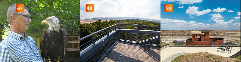 47. Lassen Sie einmal einen Jagdvogel auf dem Arm Platz nehmen! Im Adler- und Jagdfalkenhof zur Calauer Schweiz kann man unter Begleitung von Falkner Dirk von Bargen verschiedene Greifvögel kennenlernen, ihre Flugkünste in einer spektakulären Flugshow erleben – und Mutige leihen ihren Arm als Vogelsitz.