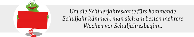 Um nicht mit längeren Wartezeiten zu rechnen, hier ein guter Tipp aus unserer Erfahrung: Kümmern Sie sich am besten schon dann um die Karte des nächsten Schuljahres, wenn Sie wissen, welche Schule Ihr Kind im kommenden Schuljahr besucht. Wir starten mit dem Verkauf im Kundenzentrum in der Stadtpromenade in der Regel im März.