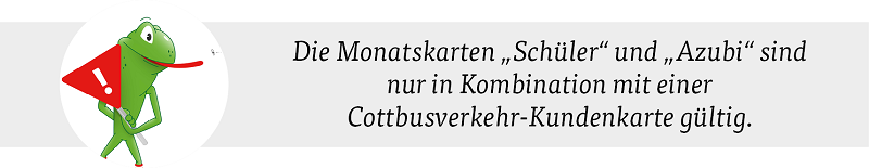 Auch sie können ermäßigt fahren – nämlich mit der Monatskarte „Schüler“. Sie ist ein Viertel günstiger als eine reguläre Monatskarte und kann auch von Schülern genutzt werden, die ihren Wohnsitz im Umland oder außerhalb haben. Wer die Schule beendet hat und nun als Auszubildende/r durchstartet, wählt die Monatskarte „Azubi“. Der Tarifbereich kann dabei sogar frei gewählt werden. Aber Achtung: Ermäßigte Monatskarten sind nur in Kombination mit einer Cottbusverkehr-Kundenkarte gültig!