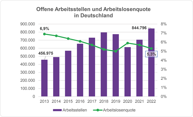 Der Fachkräftemangel ist in aller Munde – und ein Blick auf zwei einfache Statistikwerte verdeutlicht schon heute das Problem. Die Arbeitslosenquote sinkt, gleichzeitig steigt die Anzahl an freien Arbeitsstellen in Deutschland. Das bedeutet im Umkehrschluss: Für immer mehr Stellen stehen immer weniger Menschen zur Verfügung. Das hängt mit der Altersstruktur der deutschen Bevölkerung zusammen: Während immer mehr Menschen aus der Babyboomergeneration in Rente gehen, rücken weniger junge Leute nach.