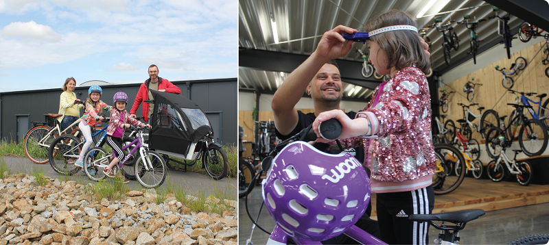 Im Multimarken-Store in Hoyerswerda stehen uns noch weitere Marken zur Auswahl. Das vielfältige Sortiment auf insgesamt 450 Quadratmetern Verkaufsfläche macht die Wahl nicht eben leicht. Wir vertrauen daher für die Proberunde auf der Teststrecke direkt am Store auf die Empfehlung von Mitarbeiter Micha. Die Kids dürfen sich zwei Kinderräder von woom aussuchen, eine junge Marke aus Österreich, die sich auf die Herstellung von superleichten und sicheren Kinderrädern spezialisiert hat. Den farblich passenden Helm gibt es praktischerweise auch. Die Kleine verliebt sich sofort in das lilafarbene Modell, das mit knapp acht Kilogramm Gewicht für sie sehr leicht zu händeln ist. Die Große wagt sich an ein E-Bike. Denn, so die Erfahrung von Verkaufsprofi Micha, die Variante mit Motor-Unterstützung wird immer öfter auch von Familien mit Kindern nachgefragt. Bei der kleinen Runde über die hügelige Teststrecke erweist sich der Motor als hilfreich. Für die Eltern fällt die Wahl auf die Premium-Marke Riese & Müller, die sich auf die Herstellung hochwertiger, individueller E-Bikes spezialisiert hat. Unser Fazit: Die Räder machen einen guten ersten Eindruck, doch vor der Kaufentscheidung kommen wir noch mal wieder und leihen uns die Räder für einen ganzen Tag aus.