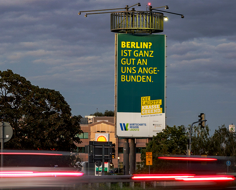 Selbstbewusst präsentiert sich die Lausitz mit der aktuellen Imagekampagne zwischen Berlin und BER: An der B96a in Richtung Flughafen hat dieses Kampagnenmotiv während der Sommerferien und danach auf die Region und ihre gute Anbindung an die Hauptstadtregion aufmerksam gemacht. Quelle: WRL