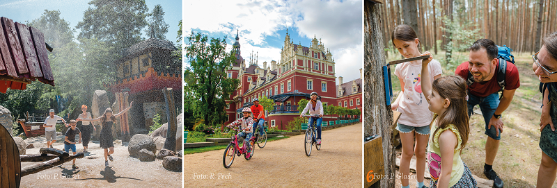 Das Rad bietet sich ebenfalls an, um den Muskauer Park in seiner Größe und Weite zu erkunden, dehnt er sich doch zu einem großen Teil auf polnischem Boden aus. Kindern wird es bestimmt gefallen, wenn sie in einer Pferdekutsche oder mit der Muskauer Waldeisenbahn durch das UNESCO-Welterbe fahren. Die Züge auf schmalen Gleisen steuern auch den Rhododendronpark in Kromlau an. Von Bad Muskau aus empfiehlt sich außerdem ein Abstecher ins polnische Leknica. Der Lehrpfad an der früheren Braunkohlegrube „Babina“ vermittelt viel Wissenswertes über Besonderheiten des UNESCO Global Geoparks Muskauer Faltenbogen. Informations- und Kartenmaterial dazu ist beispielsweise in der Alten Ziegelei in Klein Kölzig erhältlich.