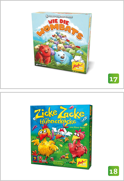 Wombats sieht man selten allein. Doch wo tummeln sich die wenigsten und wo die meisten? Gemeinsam schätzen die Spieler möglichst schnell und richtig, wo wie viele Wombats über Weiden wuseln. Dann legen sie alle Wombatkarten zu einem Muster aus, das die possierlichen Tierchen in aufsteigender Anzahl ihrer Häufigkeit nach auf den Karten zeigt. Zum Teamwork dazu gehört auch, die Sanduhr immer dann umzudrehen, wenn eine Minute mal wieder aus weniger Sekunden besteht, als man das so geschätzt hätte. Wie die Wombats ist ein temporeicher, kooperativer Augen- und Kopfverdreher, bei dem nichts so wenig ist, wie es scheint, aber vieles viel mehr, als es aussieht.
