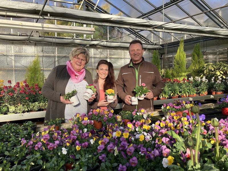 Für die Osterdekoration setzt Center-Managerin Madeleine Matschke (Mitte) in diesem Jahr auf regionale Partner: Die Blumen kommen von Ines und Frank Niere, Inhaber der gleichnamigen Gärtnerei.