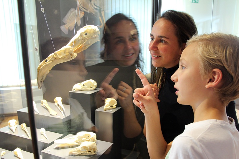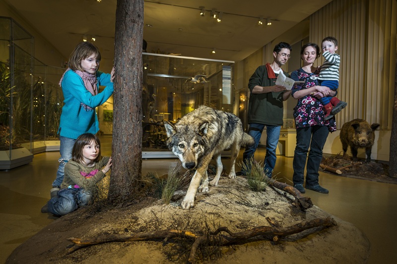 In angeschlossenen Häusern und Laboren wird zur Natur geforscht. Dazu zählt auch die Säugetierkunde mit Analysen der Nahrungsökologie und Verwandtschaftsstruktur einheimischer Raubsäuger wie dem Wolf. Belegexemplare der Forschung werden in der Museumssammlung aufbewahrt, die von Expert*innen aus der ganzen Welt genutzt wird – ein Wissen, das sich auch in der Ausstellung wiederfindet.