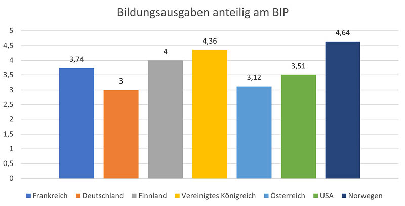 Die Schulen brauchen also mehr Personal – mehr Lehrer, aber auch andere Berufsgruppen. Dafür braucht es zunächst einmal mehr Geld. Da stellt sich die Frage, ob ein vergleichsweise reiches Land wie Deutschland zu wenig Geld für Bildung ausgibt? Die OECD hat in ihrer 2018 veröffentlichten Studie „Bildung auf einen Blick“ verschiedene Indikatoren international miteinander verglichen. Unter anderem schauten die Autoren, wieviel Prozent des Bruttoinlandsproduktes jedes Land für Bildung ausgibt. Mit drei Prozent liegt Deutschland unter dem OECD-Schnitt von 3,51 Prozent und deutlich hinter PISA-Gewinnern wie Finnland.