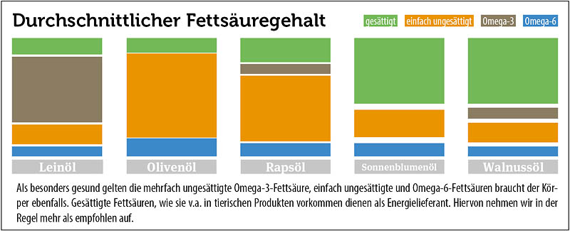 Aufgrund ihrer unterschiedlichen Inhaltsstoffe lohnt es sich, verschiedene Öle zu verwenden. Die Klassiker in der Küche sind Raps-, Oliven- und Sonnenblumenöl. Rapsöl eignet sich durch die Hitzebeständigkeit und Geschmacksneutralität für fast alle Gerichte. Es enthält viel Vitamin E und besonders viele der gesunden ungesättigten Fettsäuren. Sonnenblumenöl zeichnet sich durch einen hohen Anteil an Vitamin E und Omega-6-Fettsäuren aus. Olivenöl enthält vergleichsweise viel einfach gesättigte Fettsäure und sekundäre Pflanzenstoffe. Sein intensives Aroma macht es zum idealen Begleiter von Salat und Co. Wir empfehlen auch mal Öle abseits der Klassiker zu probieren. Walnussöl und Leinöl verfeinern mit ihrem nussigen Geschmack Salate oder Quarkspeisen. Sesamöl passt gut zur asiatischen Küche.