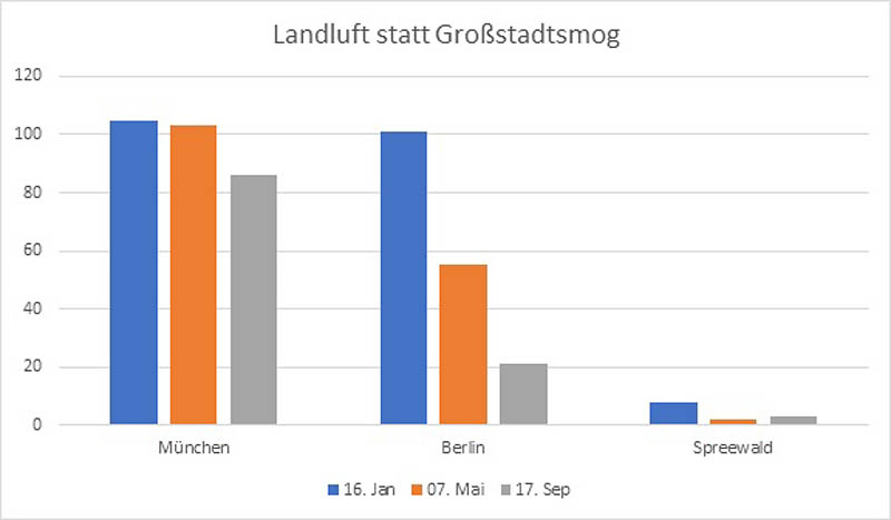 Feinstaubbelastung in µg/m3, gemessen jeweils an einem Donnerstag 9 Uhr an folgenden Mess-Stationen: München Landshuter Allee, Berlin Schildhornstraße und im Spreewald unweit von Lübbenau. Quelle: Umweltbundesamt