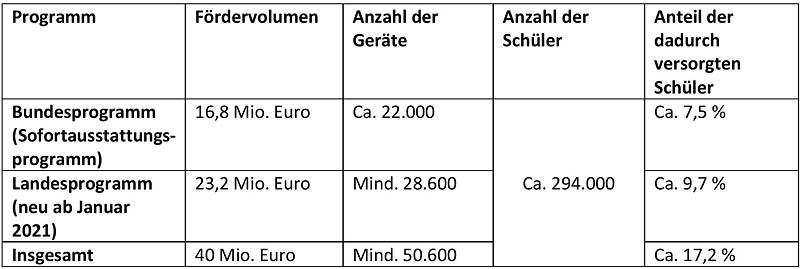 Eine Lücke will das Land mit einem kurzfristig auflegten landeseigenen Programm in Höhe von 23,2 Millionen Euro stopfen. Wie schon das Sofortausstattungsprogramm des Bundes aus dem Spätsommer 2020 dient das Programm der Anschaffung von Notebooks und Tablets für Schüler. Zusammen mit den 16,8 Millionen Euro aus dem Bundesprogramm kommt das Land dadurch auf Investitionen in Schüler-Endgeräte in Höhe von insgesamt 40 Millionen Euro.