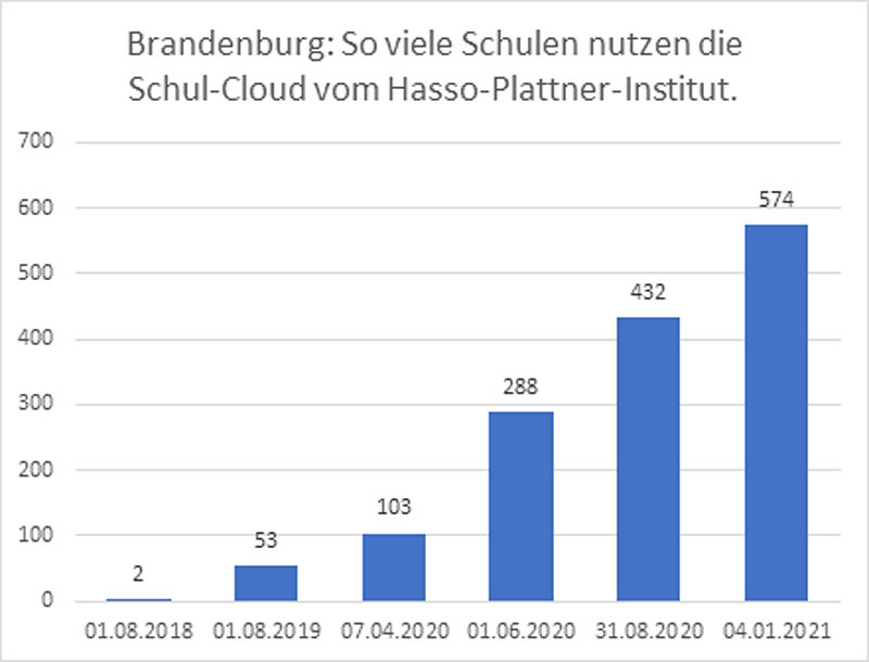 Seit dem 4. Januar 2021 gilt wie schon im Frühjahr das Distanzlernen für fast alle Brandenburger Schüler. Als Grundlage dienen dafür digitale Lernumgebungen, auf die Schüler/innen und Lehrer/innen jederzeit zugreifen können. In Brandenburg sind an den meisten Schulen die „Schul-Cloud Brandenburg“ vom Hasso-Plattner-Institut sowie „Fronter“ im Einsatz. Erstere ist derzeit an 574 von rund 900 Schulen im Einsatz. Fast 80 Prozent der Grundschulen sind dort angemeldet und 60 Prozent der Gymnasien- und Oberschulen. Die Anzahl der verknüpften Schulen stieg seit dem ersten Lockdown im Frühjahr 2020 sehr schnell an: