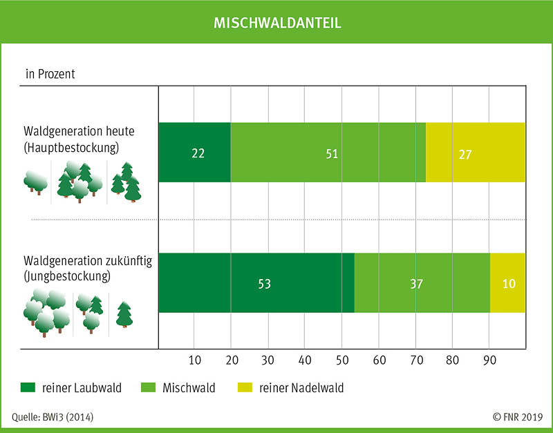 Der Waldumbau hat bereits begonnen – die Grafik zeigt, dass die künftige Waldgeneration einen deutlich höheren Anteil an Mischwald haben wird. Grafik: FNR 2019