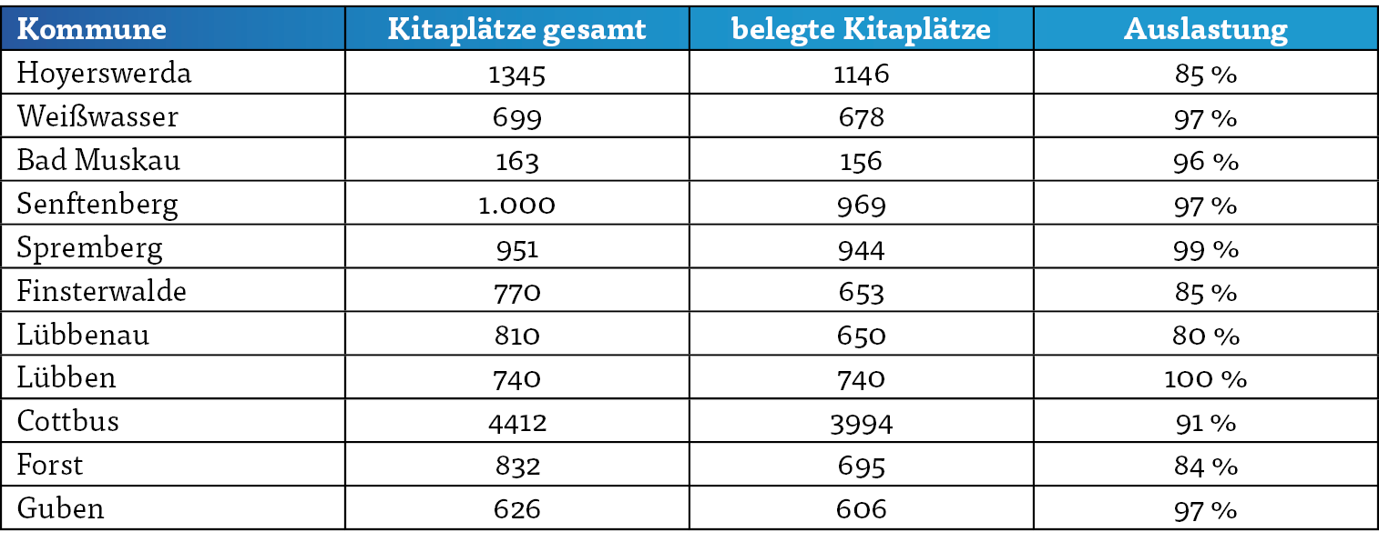 Aktuell sind die meisten Kitas in der Lausitz gut ausgelastet, wie eine Umfrage der „lausebande“ in den Kommunen zeigt. Viele Kindergärten melden für das Schuljahr 2019/2020 eine Belegung von fast 100 Prozent. Während in den Krippen oft noch freie Plätze zu haben sind, liegt die Auslastung im Kindergarten in einigen Einrichtung sogar über 100 Prozent. Hier wurden aufgrund der hohen Nachfrage kurzfristig zusätzliche Kapazitäten geschaffen.