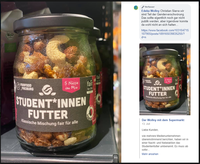 Dieses Foto eines Edeka-Marktes löste neben Zustimmung viel Häme aus, der Marktleiter reagiert mit Humor und kommentiert: „Wir sind Teil der Genderverschwörung…. In den nächsten Wochen werden wir noch weitere Lebensmittel umbenennen… Passend zum deutschen Naturell starten wir mit Kartoffel*innen.“