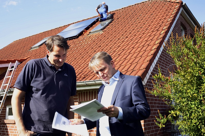 Immer mehr Eigentümer nutzen die Kraft der Sonne zur Herstellung von Strom oder Wärme – hier eine Solarthermieanlage auf dem Dach eines Einfamilienhauses. Foto: www.co2online.de / Alois Müller