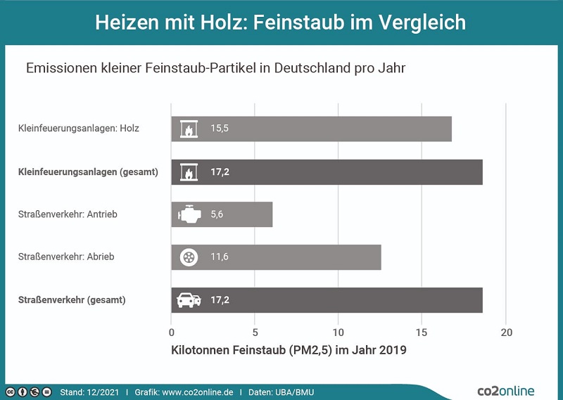 Kamine verursachen jährlich in Deutschland genauso viel Feinstaub wie der Straßenverkehr. Grafik: www.co2online.de