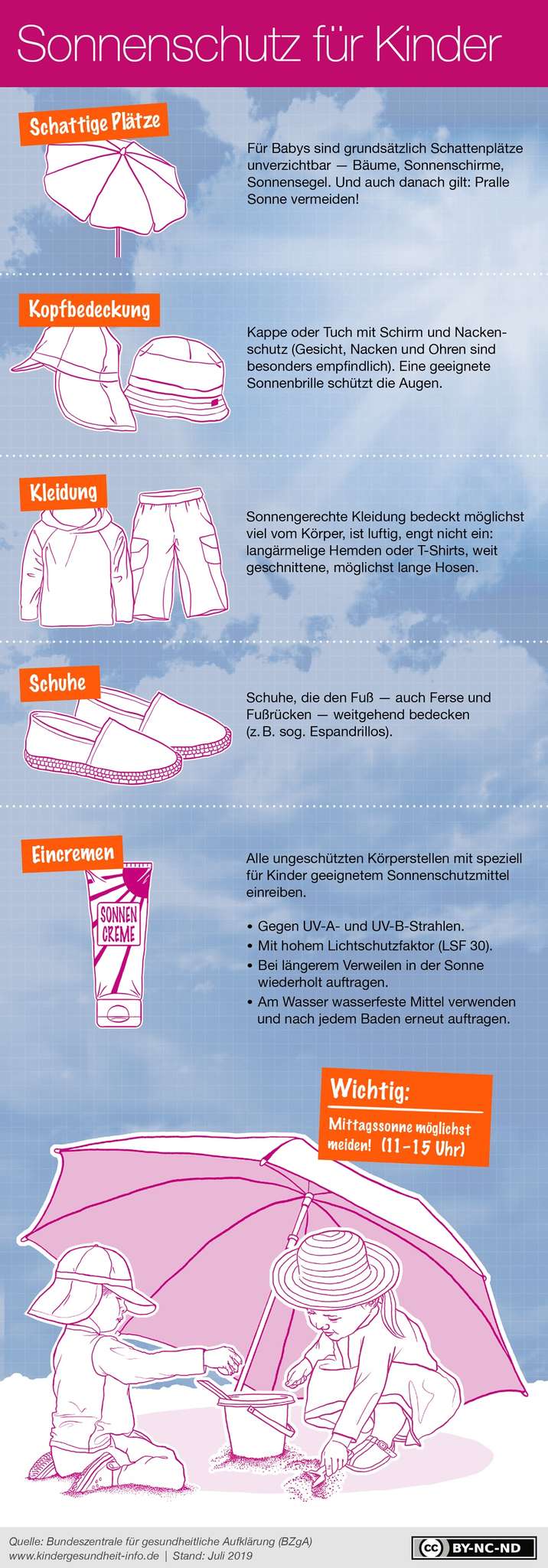 Kinder sind besonders gefährdet, denn ihre Pigmentzellen sind noch nicht voll entwickelt. Die Haut muss ihr Schutzsystem erst noch aufbauen. Daher dürfen Babys unter einem Jahr gar nicht der direkten Sonne ausgesetzt werden. Größere Kinder sollten an sonnigen Tagen mit hoher UV-Belastung nur mit ausreichend Sonnenschutz ins Freie. Das kann Sonnencreme sein oder langärmelige Kleidung. Es gibt auch spezielle UV-Schutz-Kleidung. In der Mittagszeit zwischen etwa 11 bis 15 Uhr sollte die Sonne gänzlich gemieden werden. Nicht umsonst halten die Menschen in südlichen Ländern in dieser Zeit Siesta und ziehen sich in ihre Häuser zurück. Bei kleinen Kindern sind die Haare oft noch so dünn, dass der Kopf zusätzlich geschützt werden muss. Ein Strohhut oder Basecap schützt die Kopfhaut, je nach Modell auch den Nacken.