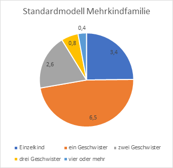 Entgegen anderslautenden Meldungen sinkt die durchschnittliche Kinderzahl pro Familie nicht. Eine Frau in Deutschland bringt im mathematischen Schnitt 1,5 Kinder zur Welt. Etwa jede fünfte Frau bleibt kinderlos. Zum Vergleich: In Frankreich liegt die Geburtenrate bei 1,8 Kindern, in Spanien bei 1,2 Kindern. Es lässt sich aus den Statistiken auch kein Trend zum Einzelkind ablesen. Zwar ging die durchschnittliche Kinderzahl in deutschen Familien im vergangenen Jahrhundert stark zurück. Seit den 1990er-Jahren aber liegt der Anteil der Kinder, die dauerhaft ohne Geschwister aufwachsen, relativ stabil bei knapp 20 Prozent. Ein recht junger Trend, von dem sich erst noch zeigen muss, ob er langfristig stabil ist: Drei ist das neue Zwei. Der Anteil der Geburten eines dritten Kindes hat in den letzten zehn Jahren leicht zugenommen, während der Anteil der Einzelkinder zurück ging. Immer mehr Familien trauen sich ein drittes Kind zu. Der Klassiker aber ist weiterhin mit etwa 50 Prozent die Zwei-Kind-Familie.