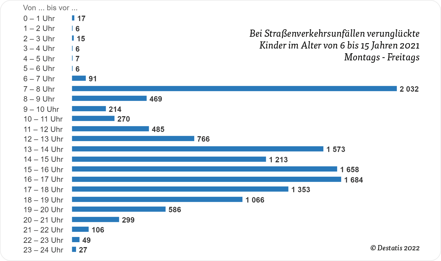 - Kinder verunglücken häufiger an Werktagen und vor allem morgens zwischen 7 und 8 Uhr sowie nachmittags zwischen 13 und 17 Uhr.