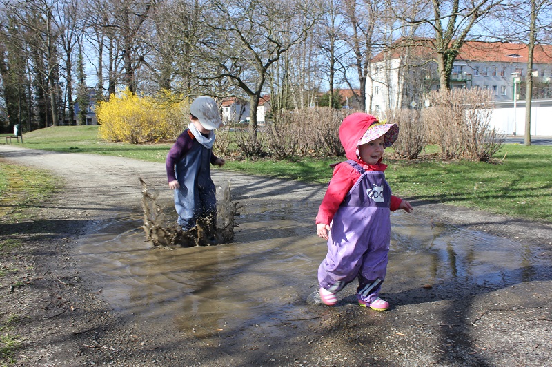 Beim Glücklichsein können wir manches von unseren Kindern lernen, die viel öfter lachen als Erwachsene und sich schon an Kleinigkeiten erfreuen – wie an einer Pfütze.