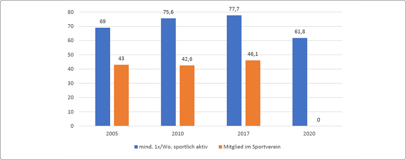 Für die Studie „Jugend in Brandenburg“ werden seit 1991 Jugendliche zwischen 12 und 18 Jahren befragt, dabei geht es auch um ihre sportlichen Aktivitäten. Bis zur 2017er-Studie waren etwa drei Viertel aller Jugendlichen mindestens ein Mal pro Woche in ihrer Freizeit sportlich aktiv. Im ersten Corona-Jahr 2020 waren es nur noch gut 60 Prozent, was einem Rückgang um 15 Prozentpunkte entspricht. Mitglied in einem Sportverein sind gut 40 Prozent der Befragten.