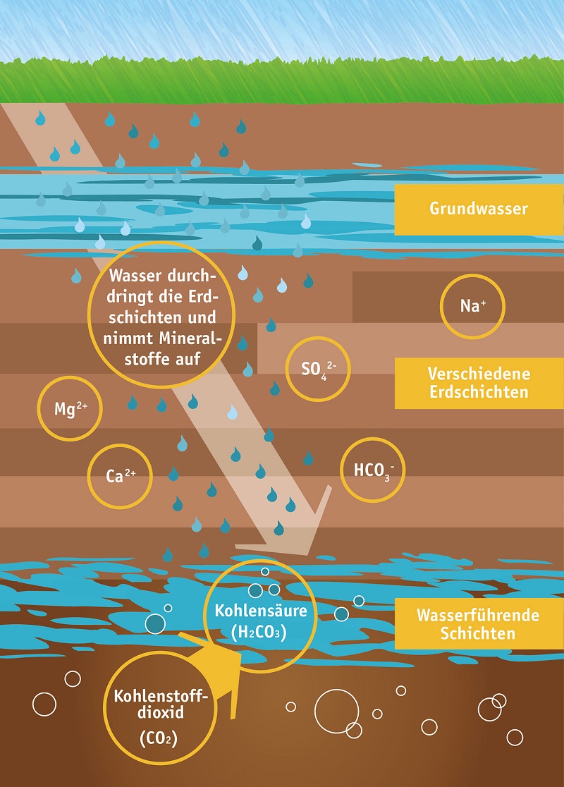Die Grafik zeigt, wie Mineralwasser bei seiner Entstehung Mineralstoffe aufnimmt. © Informationszentrale Deutsches Mineralwasser (IDM)