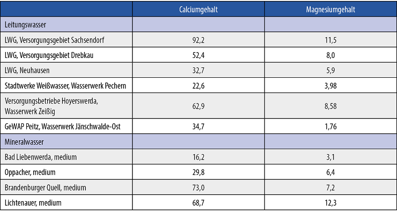 Leitungs- und Mineralwasser im Vergleich: Angaben in mg/l, Quelle: Wasserversorger und Webseite/ Etikett des jeweiligen Mineralwassers.