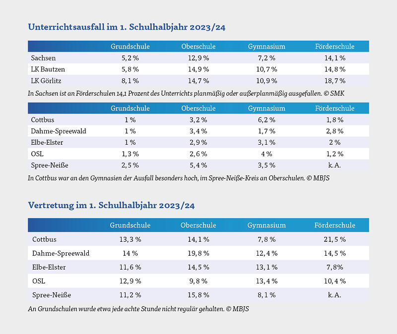 Im zurückliegenden Schuljahr fanden an sächsischen und Brandenburger Schulen je nach Zählweise und Definition sowie in Abhängigkeit von der Region und der Schulart zwischen 10 und 25 Prozent des Unterrichts nicht planmäßig statt. In einigen Ausnahmefällen musste sogar für ein Drittel der Stunden eine Vertretung gefunden werden. Die Stunden, die planmäßig (z.B. wegen Lehrkräftemangel) oder unplanmäßig (z.B. wegen Krankheit oder Streik) nicht gegeben werden konnten, wurden nur teilweise durch Vertretung aufgefangen. Das kann aber auch heißen, dass die Kinder Stillbeschäftigung hatten, dass fachfremder Unterricht erteilt wurde oder dass Klassen zusammengelegt wurden und eine Lehrerin 50 Kinder unterrichtet. Es gibt keine bundesweit einheitlichen Standards zur Erhebung von Unterrichtsausfall. Beispielsweise gibt es Bundesländer, die jene Stunden nicht als Ausfall erfassen, bei denen schon zu Schuljahresbeginn klar ist, dass sie nicht gegeben werden können – einfach weil das Personal fehlt. Daher sind die Zahlen für Sachsen und Brandenburg nur bedingt vergleichbar. Sie zeigen aber, welche Regionen und Schularten besonders betroffen sind.