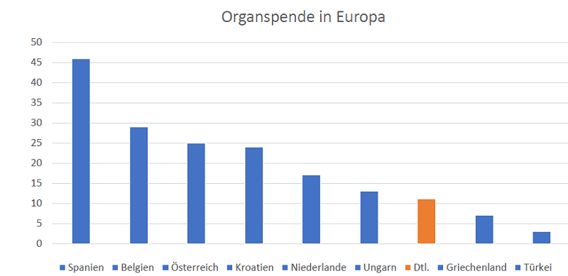 Der Wert zeigt die Zahl der Organspender je 1 Mio. Einwohner in 2022 an. Quelle: organspende.info